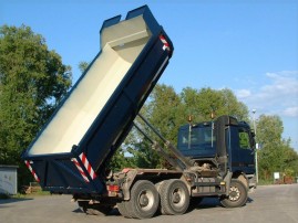 Designed for the transport of building rubble and aggregates. The containers are structurally designed with regard to maximum resistance in harsh conditions. They are made of high-strength and abrasion-resistant steel (HB 400/450), the solid upper hem of QSTE. For easy emptying, equipped as standard with a robust raised fl ap with massive locking. On request, we supply containers with a hydraulically operated flap. The raised front, which is also made of high-strength steel, protects the vehicle‘s cab in the demanding conditions in which this type of container is most often used.