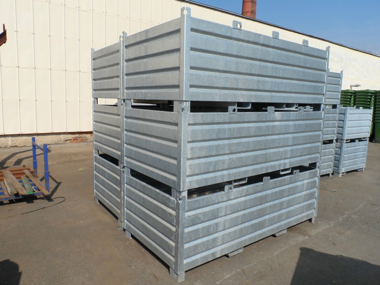 The steel storage boxes (USB) are intended for the collection and transport. Thanks to their sturdy steel sheeting construction they are highly resistant, even when used daily. Different sizes can be stacked (max. 3 units). The containers can be handeled by a forklift.